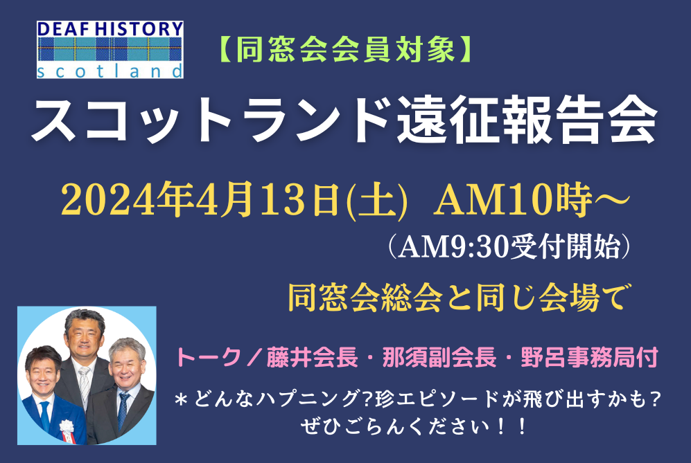 総会に先立ち、午前中は「スコットランド遠征報告会」がおこなわれ、藤井会長・那須副会長・野呂事務局付の3人が代わる代わる、エピソードやウラ話などを面白おかしく語り、会場は爆笑の渦に包まれました。